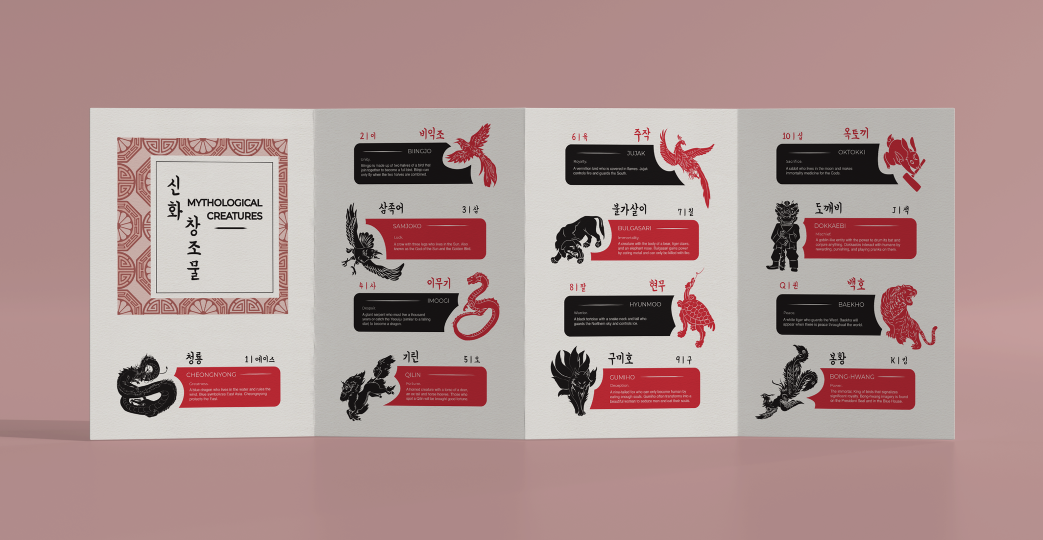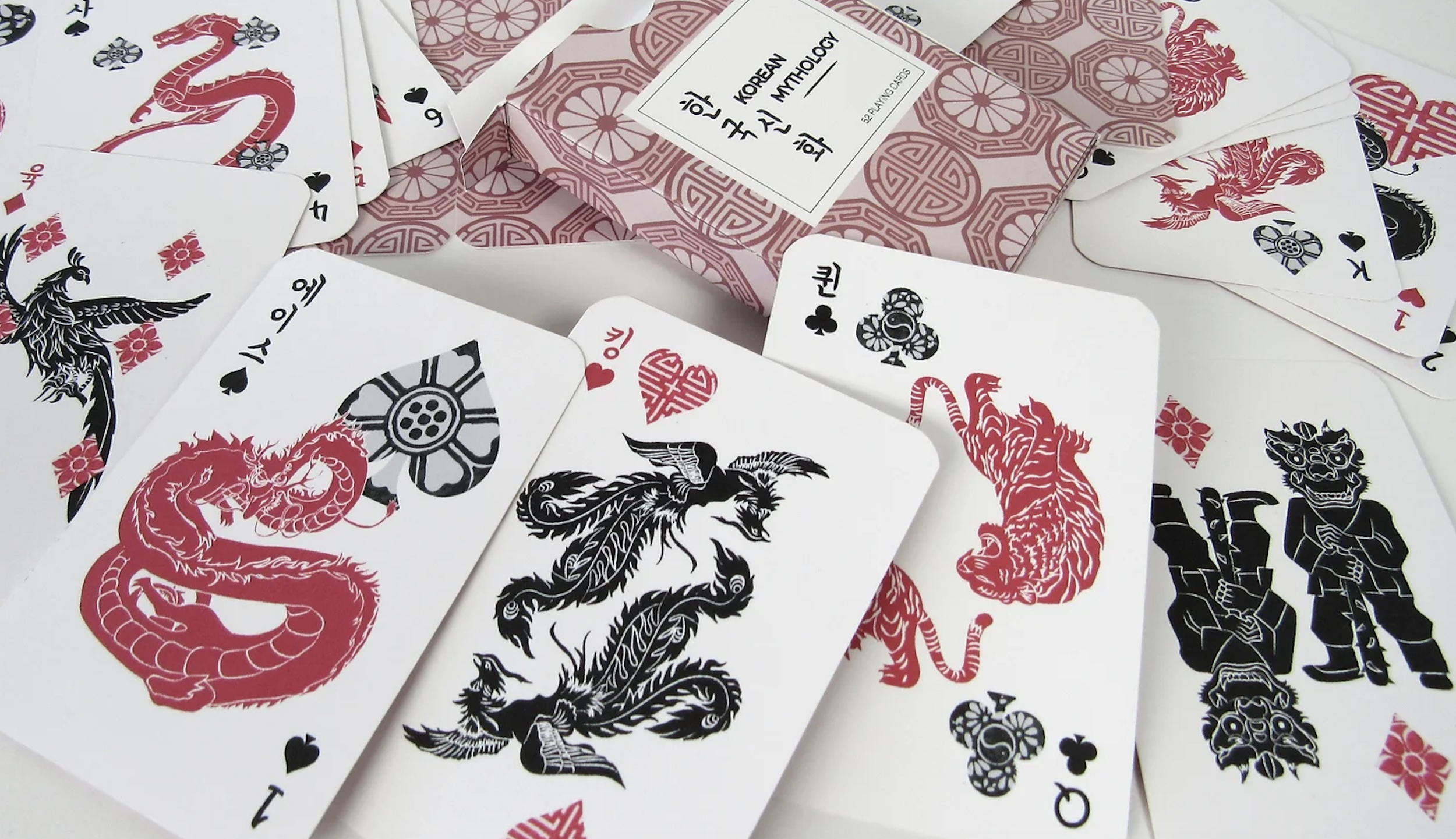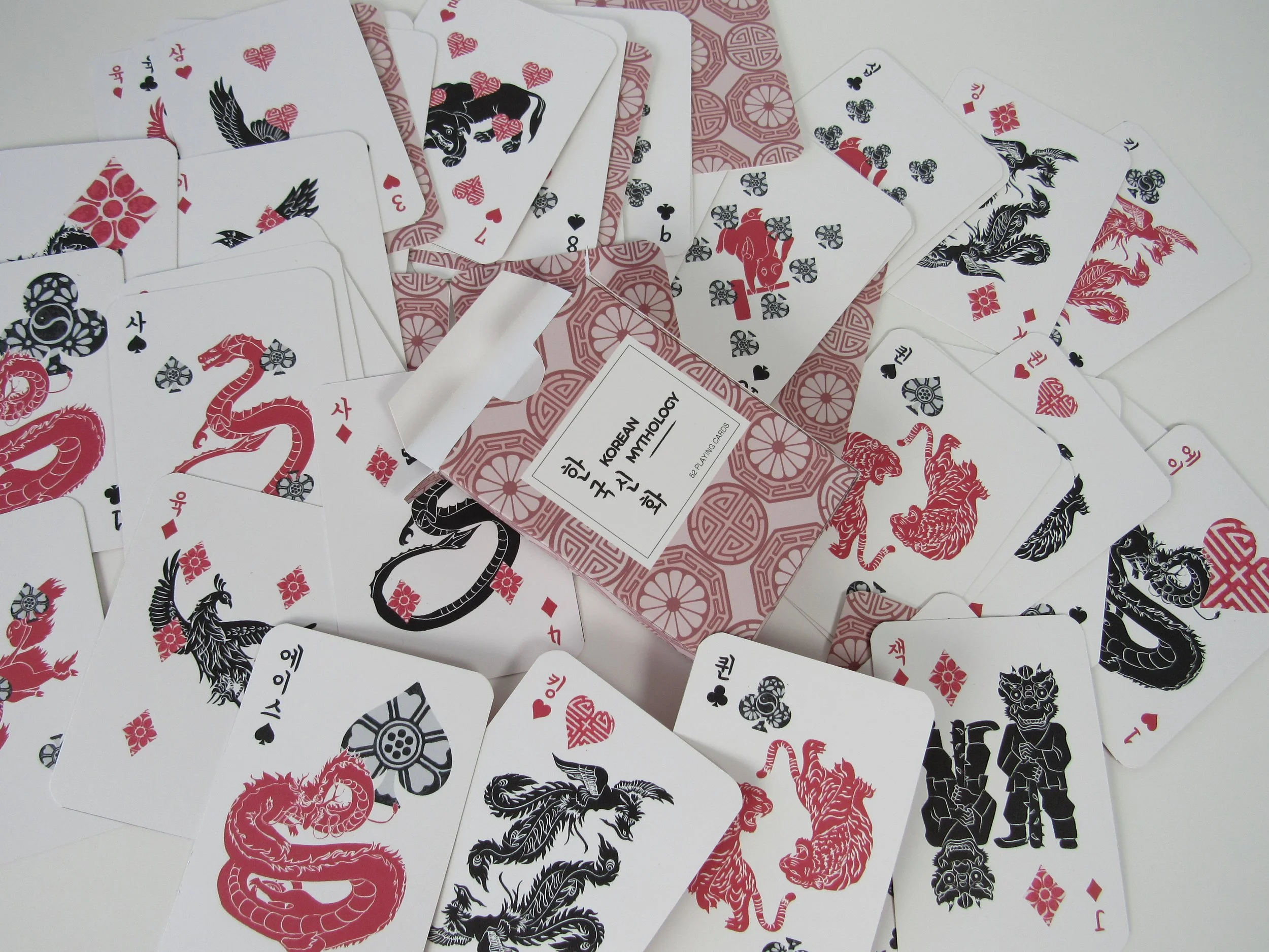 A custom designed deck of playing cards inspired by Korean mythology. Each card in the deck features hand drawn illustrations of mythological characters from Korean folklore, figures that shaped my imagination growing up through stories told by my grandma.