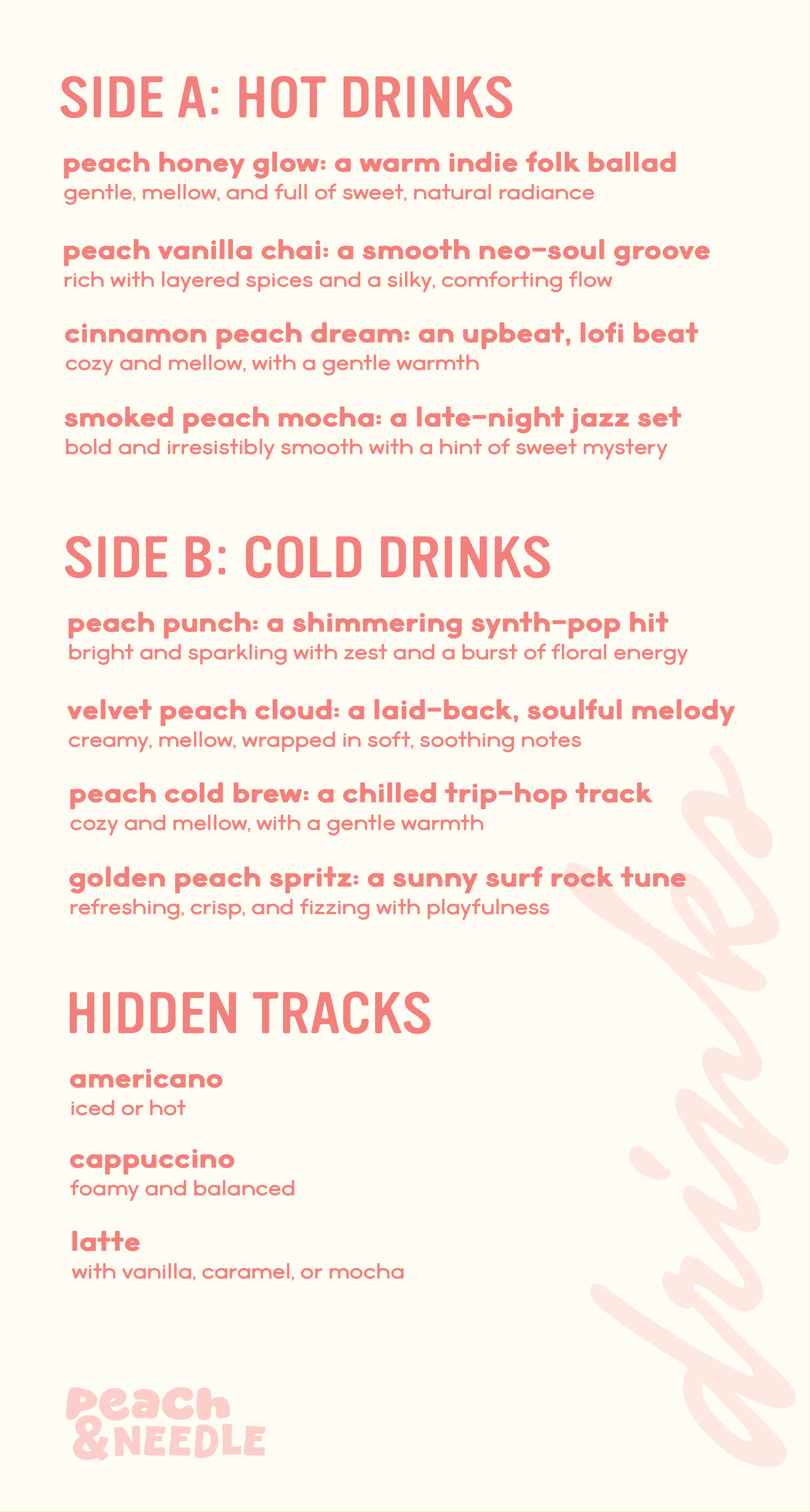 In a culture optimized for speed, scale, and constant output, quality has become rare. This concept cafe was built as a response: a space where fewer things are done with intention and care. Centered around high-quality peach-based cuisine and a curated vinyl listening space, food and music are experienced with the same level of care at Peach and Needle.